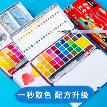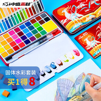 中盛画材(transon)36色固体水彩颜料8件套装 铁盒便携手绘画工具套装水彩粉饼 含水彩纸本自来水彩画笔美术写生