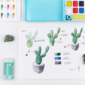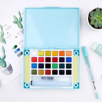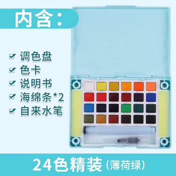 樱花24色水彩颜料、画笔、调色盘、海绵一体化设计,携带方便,适合户外写生。