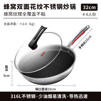 康巴赫炒锅悦厨蜂巢双面不粘锅316L不锈钢炒菜锅32cm电磁炉燃气灶通用