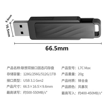 联想(Lenovo)1TB USB3.1 Type-C安卓手机U盘L7C Max双接口固态U盘 550MB/s高速办公优盘