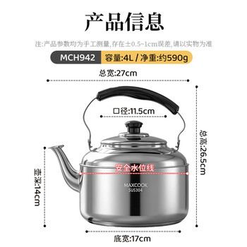 美厨(MAXCOOK)烧水壶响水壶 加厚304不锈钢4升中式鸣音 煤气电磁炉通用 MCH942
