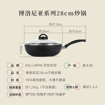 巴拉利尼(BALLARINI)不粘锅电磁炉燃气灶通用进口平底锅炒锅大肚锅炒菜锅博洛尼亚28cm