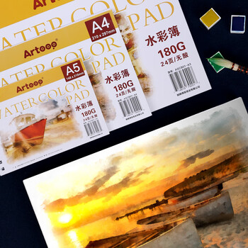中盛画材A5水彩本180g水彩纸木浆纸手绘插画水彩速写本纸便携写生四面封胶水彩画本24页/本美术写生