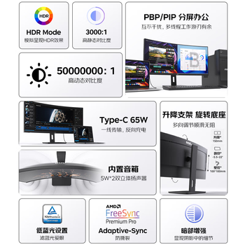 显示器主体/升降底座(支架)/电源线/工厂校准报告/说明书/保修证书/随附线缆:DP信号线一根、USB(上行)线一根、Type-C 65W全功能数据线一根