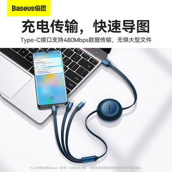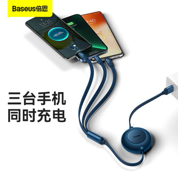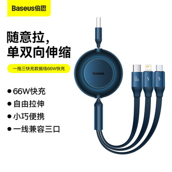 倍思数据线三合一充电线6A快充66W伸缩一拖三Type-C 适用苹果14/13小米华为mate70小米手机车载 蓝色