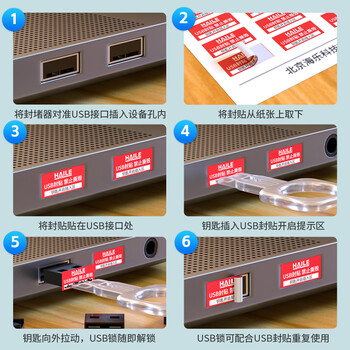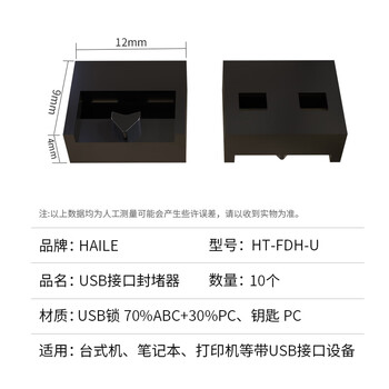 海乐(Haile)USB接口封堵器黑色 × 10、钥匙 × 1、封口贴纸 × 1、合格证 × 1。