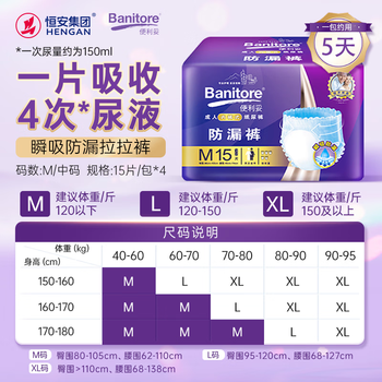 便利妥(Banitore)瞬吸防漏拉拉裤M码60片(80-105cm) 老年人尿不湿老年纸尿裤拉拉裤