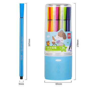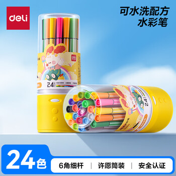 得力(deli)24色可洗水彩笔六角细杆儿童画画彩色涂色颜色笔文具收纳筒学生女孩儿童水彩笔