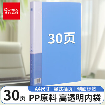 齐心(COMIX)A4/30页资料册文件夹插页袋文件册活页夹多页夹档案学生试卷科目收纳袋 办公文件保护 蓝色EA2006