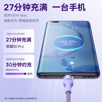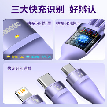 倍思 闪速系列2 一拖三快充数据线USB to M+L+C 100W 1.2m 紫色*1