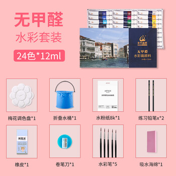 24色12ml水彩颜料1盒+水彩笔+水彩画纸梅花调色盘+海绵+折叠水桶+ 铅笔+橡皮+卷笔刀