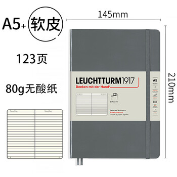 LEUCHTTURM1917商务日记本手帐送礼办公学习记事本A5中开横格笔记本深灰色软封皮123页362841