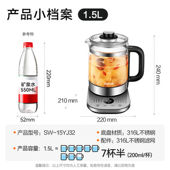 苏泊尔(SUPOR)养生壶 1.5L煮茶器 玻璃花茶壶 316L不锈钢恒温电水壶烧水壶 保温煮茶壶黑茶 SW-15YJ32