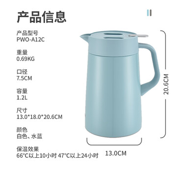 虎牌(TIGER)保温壶 304不锈钢时尚简约保温壶PWO-A12C-AC 水蓝色 1.2L