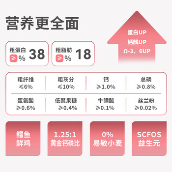 鸡肉粉25%、玉米蛋白粉、鸡油、大米、玉米、大米蛋白粉、鱼粉5%、甜菜粕、口味增强剂、鱼油、丝兰粉0.02%