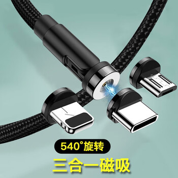 孜泰 磁吸数据线三合一苹果华为小米Type-C安卓一拖三手机充电器线 弯头直头可切换 一线三头 1米 黑色