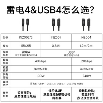 贝尔金(BELKIN)雷电4数据线 英特尔认证 PD快充100W Type-C公对公视频传输 充电线 1米被动式 INZ003