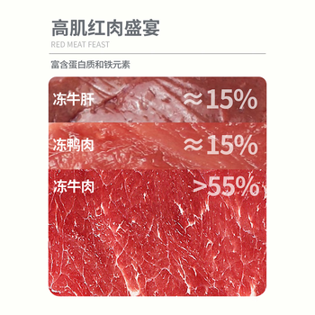 冻牛肉(55%)、冻鸭肉(15%)、冻牛肝(15%)、冻牛心(5%)、冻兔肉(5%)、鱼油(三文鱼油)、蛋粉、贻贝、豌豆纤维