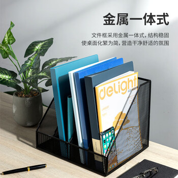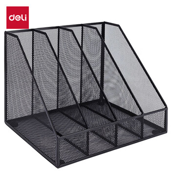 得力(deli)四联金属桌面文件框栏书立架 办公室桌面档案收纳盒多层资料架子网状镂空文件置物架 黑色78986