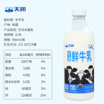 天润(TERUN)TERUN 新疆产地 鲜牛乳3.8g巴氏杀菌鲜奶家庭生鲜装950ml*1瓶