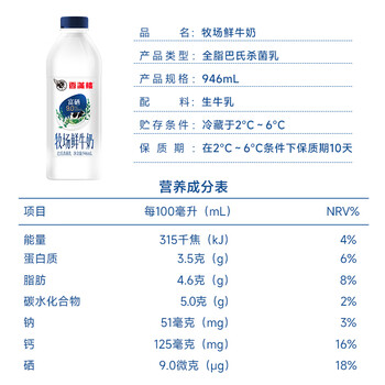 香满楼 牧场鲜牛奶鲜奶946ml/瓶