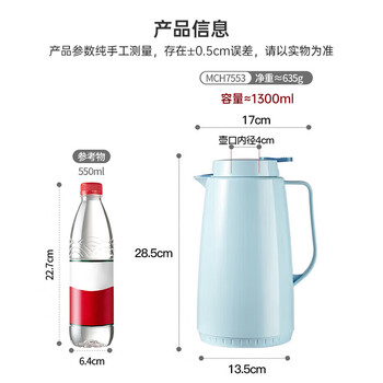 美厨(maxcook)保温壶 暖水壶宿舍热水瓶玻璃内胆真空家用开水壶1.3L 蓝MCH7553