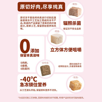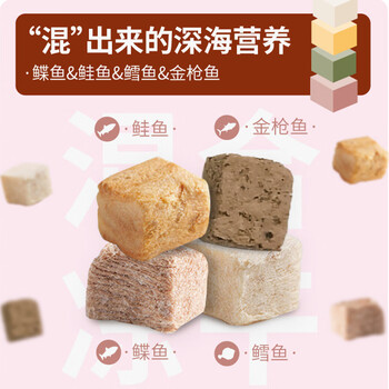 肉类及其制品(鸭肉粉310gkg、鸡油*、牛油*、鸡水解膏**、鸡水解粉**),番薯颗粒,马铃薯颗粒,豌豆,大豆磷脂油粉,甜菜粕颗粒,鱼油,丝兰粉。冻干颗粒:冷冻干燥蝶鱼(5.5g/kg),冷冻干燥雏鱼(5.5g/kg),冷冻干燥鱼(2g/kg),冷冻干燥金枪鱼(2g/kg)