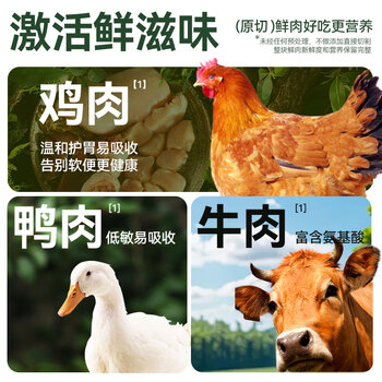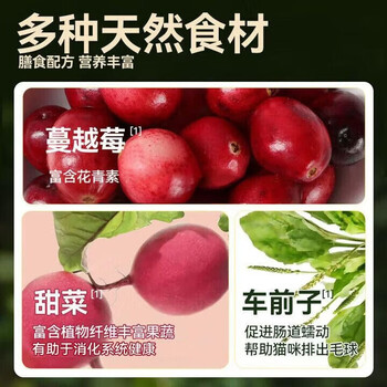 鲜鸡肉、鲜牛肉、鲜鸭肉、蛋黄粉、谷朊粉、甜菜、全脂羊乳粉、椰子油、车前子、螺旋藻粉、奶酪、蔓越莓粉