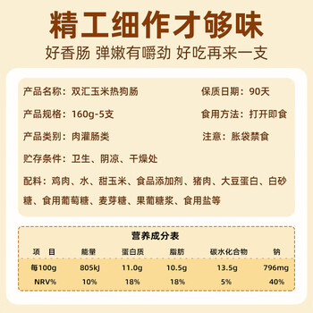 双汇 玉米热狗肠160g*5支 火腿肠 休闲零食 香肠 烧烤露营 速食 出游