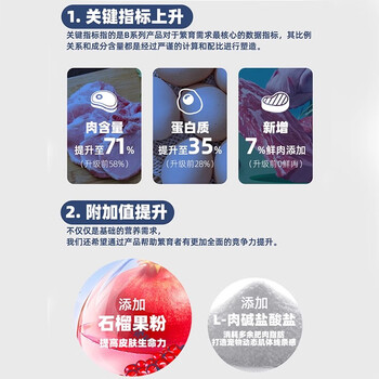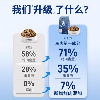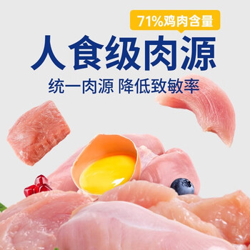 鸡肉粉(去骨)34%,豌豆12%,糙米,大米,鸡油”,鸡肉7%,牛油”,甜菜粕颗粒,鸡水解膏**,燕麦2%,鸡水解粉,大豆磷脂油粉,鱼油0.4%,纤维素(膳食纤维来源),酿酒酵母细胞壁,红石榴果粉0.01%,蓝莓粉0.01%,丝兰粉0.01%。以维生素E及迷迭香混合作为保鲜原料。"“富含小分子蛋白