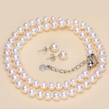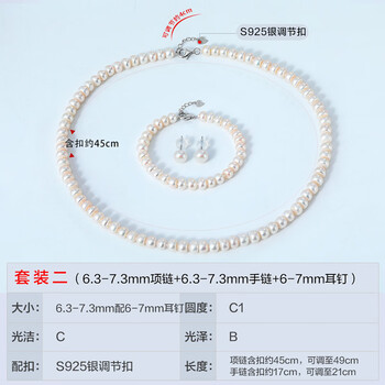 黛米S925银无核馒头圆6.3-7.3mm淡水珍珠项链耳钉套装生日礼物送婆婆