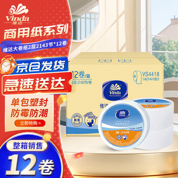品名:维达2143节双层公用卫生纸 成分:原木浆 型号:VS4418 单张规格:112mm*95mm/节 数量:2143节/卷 12卷/箱