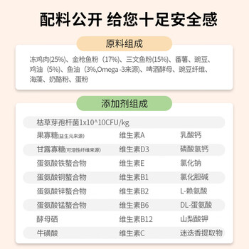 冻鸡肉(25%)、金枪鱼粉(17%)、三文鱼粉(15%)、番薯、豌豆、鸡油(5%).鱼油(3%, Omega-3来源)、啤酒酵母、豌豆纤维、海藻、奶酪粉、蛋粉;