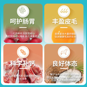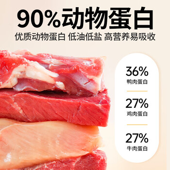 鲜鸡肉(26%)、鲜牛肉(8%)、三文鱼、玉米、糙米、全小麦粉、鸭肉粉、鸡肉粉、燕麦(3%)、甜莱粕(2%)、牛肉骨粉、鸡油、牛油、冻鸡胸肉、冻牛骨、冻鸡骨、宠物饲料复合调味料、全脂羊乳粉(0.5%)、椰子油(0.5%)、酵母水解物(0.5%)、脱水鸡肉、脱水鸭肉、鸡水解粉、鸭水解蚡、螺旋藻粉、蛋粉、鱼粉、谷阮粉、奶酪、蔓越粉。