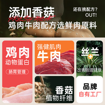 鲜鸡肉(26%)、鲜鸭肉、玉米、糙米、全小麦粉、鸭肉粉、鸡肉粉、燕麦、鲜牛肉(3%)牛肉骨粉(3%)、甜菜粕、鸡油、牛油、宠物饲料复合调味料、谷肮粉、鸡水解粉(05%)、鸭水解粉(05%)、酵母水解物、香菇(05%)、丝兰粉