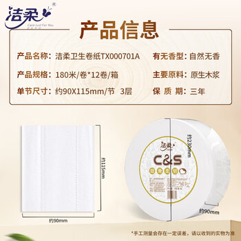 洁柔有芯大卷纸3层180米*12卷大盘纸商用卫生纸卷筒纸整箱TX000701A