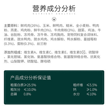 鸡肉粉(20%)、玉米、大米、小麦、牛肉粉(8%)、鸡油牛油牛肉骨粉(4%)、鸭肉粉、甜菜粕、谷阮粉、宠物饲料复合调味料、蔓越莓粉(0.3%)、蛋粉(0.3%)、丝兰粉