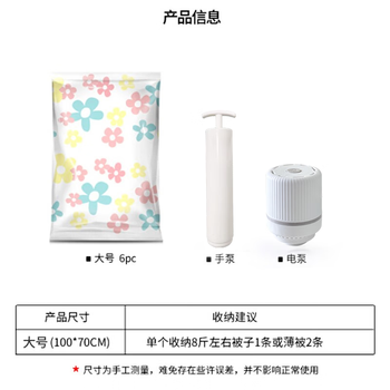 太阳花压缩袋带电泵套装 【品牌】:收纳博士(Dr.storage) 【清单】:大号:100*70cm X 6: 【配件】:手动泵:1个 ;电动泵:1个 滑片:3-4个 【压缩对象】:被子、衣物、毛绒玩具等 【功能】:防潮、防尘、防水