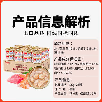 顽皮(Wanpy)泰国进口 猫罐头85g*24罐 (汤汁型)吞拿鱼+明虾成猫零食白金罐