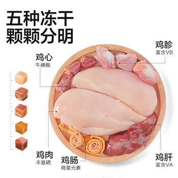 鲜鸡肉24.6%、鸡肉粉22.6%、红薯粉、冻鸡肉7.8%、马铃薯淀粉鸡肝水解物、冻干鸡肉2%、冻干鸡肝2%、冻干鸡肠2%、啤酒酵母粉、冻干鸡心1%、冻干鸡胗1%、纤维素、菊糖0.74%、鸡肝粉、海带粉、胡萝卜粉、南瓜粉