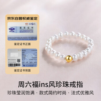 周六福黄18K金珍珠戒指女 ins风彩金戒指 单颗金珠 生日礼物
