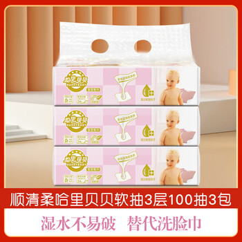 顺清柔 乳霜抽纸哈里贝贝3层100抽*3包M码 抽取式面巾纸软抽 提装销售