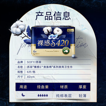 苏菲Sofy 裸感S进口纯棉超柔软贵族系列量多夜用卫生巾 420mm 6片*1