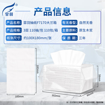 型号:F7170 单张规格:100mm*180mm/张 净含量:110抽/包 层数:3层 规格:110抽/包 110包/箱