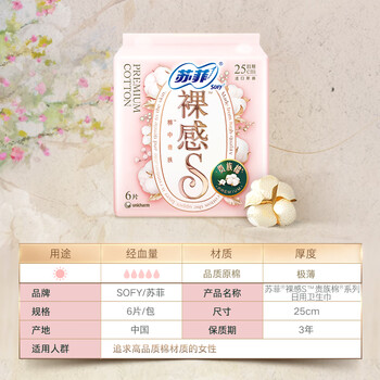苏菲裸感S贵族棉纯棉日用卫生巾25cm6片透气亲肤敏感肌姨妈巾京东自营