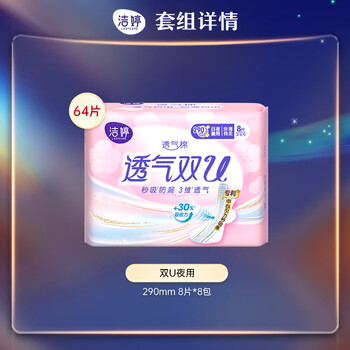 洁婷日夜兼用卫生巾组合双U秒吸防漏姨妈巾8包64片京东自营官方旗舰