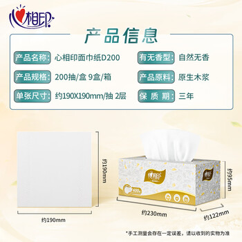 品名:心相印D200商用长抽纸 成分:原生木浆 单张规格:190mm*185mm/张 数量:200抽*2层 9盒/箱