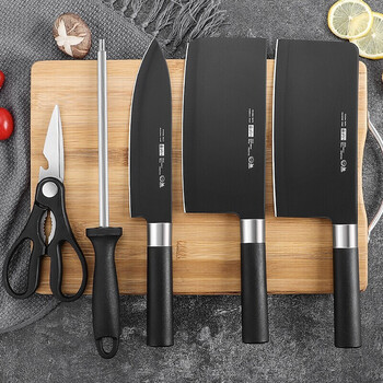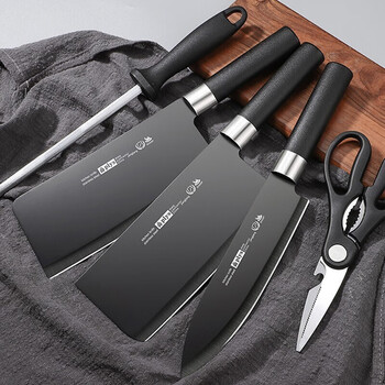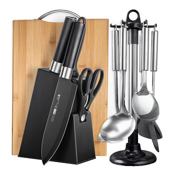 菜刀*1、砍骨刀*1、多用刀*1、剪刀*1、磨刀棒*1、刀座*1、支架*1、汤勺*1、漏勺*1、锅铲*1、饭勺*1、漏铲*1、菜板*1