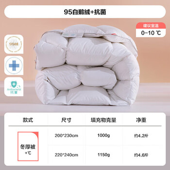 LOVO罗莱家纺 95%白鹅绒羽绒被子 1150g填充220*240cm 白色