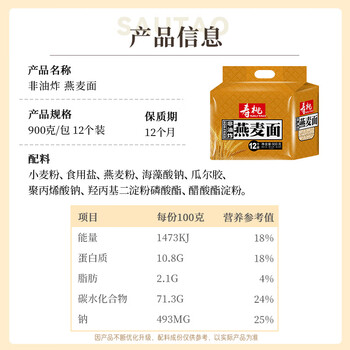 寿桃燕麦面方便面低脂粗粮代餐波纹面饼非油炸方便速食12个装900g/包